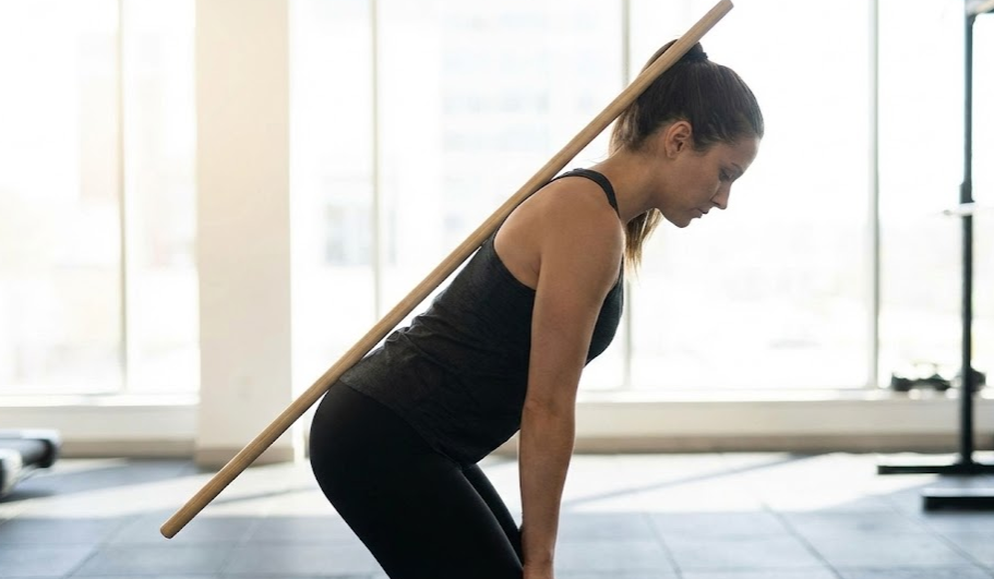 이 상태에서 인사를 하듯 고관절을 접어 상체를 숙여보세요. 움직이는 동안 막대기가 세 지점에서 하나라도 떨어진다면 척추 중립이 깨진 것입니다. 허리가 구부러지면 꼬리뼈나 머리가 떨어지고, 허리를 과하게 꺾으면 등 상부가 떨어지게 됩니다.